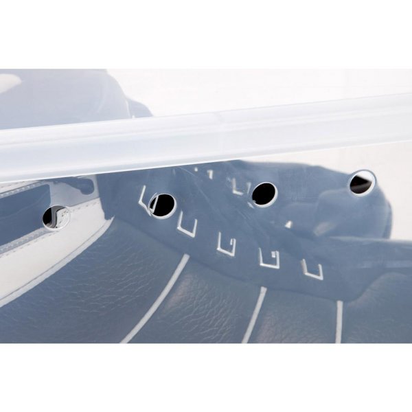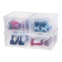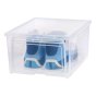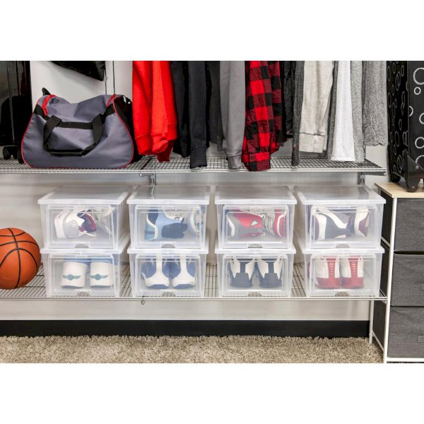 These unique shoe storage boxes have an ultra clear window to let you see what's stored inside. The front panel lifts up and locks into place, allowing easy access to shoes without unstacking multiple units. Ventilation holes on both sides allow air circulation. Sized to fit most men's shoes up to size 13.
