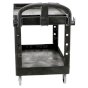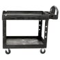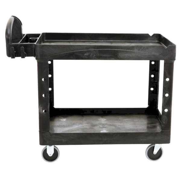 Handy, durable utility cart features rust-, dent-, chip- and peel-proof structural foam construction. Ergonomically designed push handle provides optimum hand placement and push height improving control and worker safety. Molded-in storage compartments, holsters, hooks and notches. Rounded corners and shelf walls won't damage furniture and walls. Variable grip-height handle improves control and worker safety. Built-in tool holster and molded-in fittings allow for easy addition of pipes or rods. 750 lb. capacity. Color: Black; Capacity (Weight): 500 lbs.; Caster/Glide/Wheel: Two 5" Swivel Non-Marking Casters; Material(s): Structural Foam.