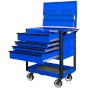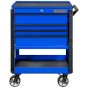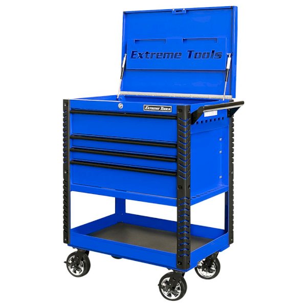 Extreme Tools EX Professional Series 33 in. 4-Drawer Deluxe Tool Cart (patent-pending) can be used as a stand-alone tool cart or it can be combined with the Extreme Portable Workstation. The most unique feature of this tool cart is the top storage compartment. Open the lid and you can access all your tools in the top drawer as well as tool hangers/holders on the sides of the cart. The closed lid securely holds a PVC coated MDF top creating a durable work surface and still allows access to the top drawer. It is the most versatile design you will find. Quick Release self-latching anodized aluminum drawer pulls keep drawers closed until you are ready to open them. Heavy-duty ball bearing slides on the drawers are load-rated 100 lbs. per drawer. The carts corners are covered in tough, impact-resistant non-marking bumpers. Four 6 in. x 2 in. proprietary Mag Wheel lockable swivel casters allow you to easily move the tool cart in your workspace. As an added bonus, we have included our Power Tool Rack accessory which hangs off the side of the tool cart and keeps your power tools within easy reach.