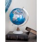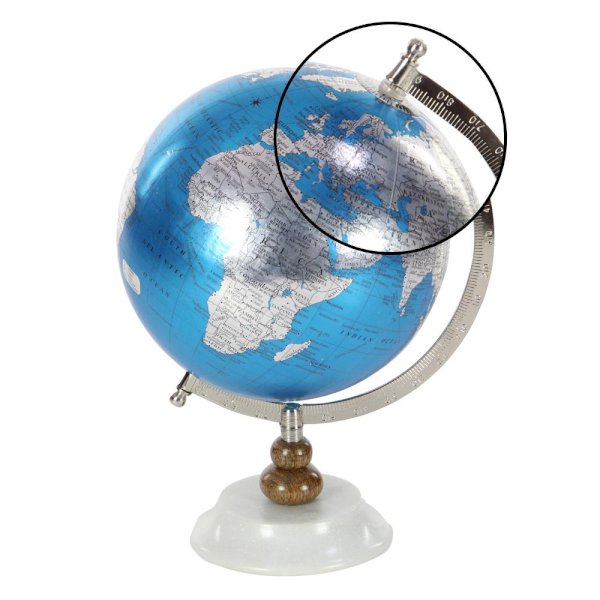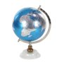 Features a silver and blue-finished globe with a silver-finished iron axis