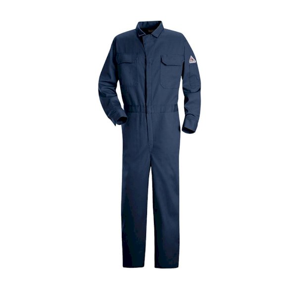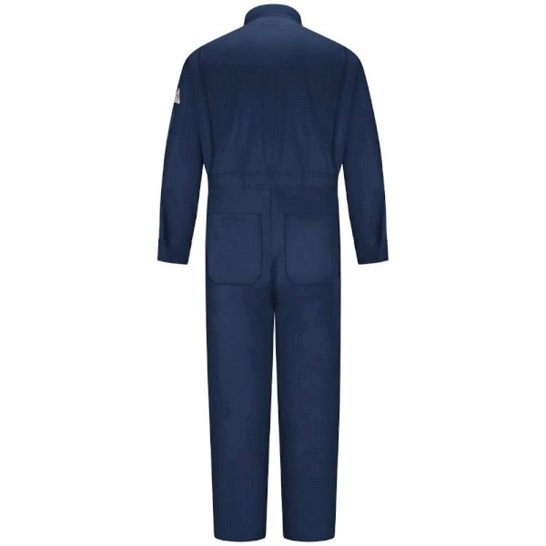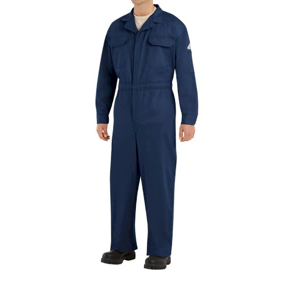 1-piece, topstitched, lay-flat collar. 2-way, concealed, Nomex taped, brass break-away zipper with concealed snap at top of zipper and at neck. Concealed snap closure on cuff. Elastic waist inserts.