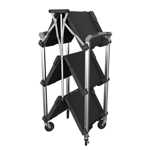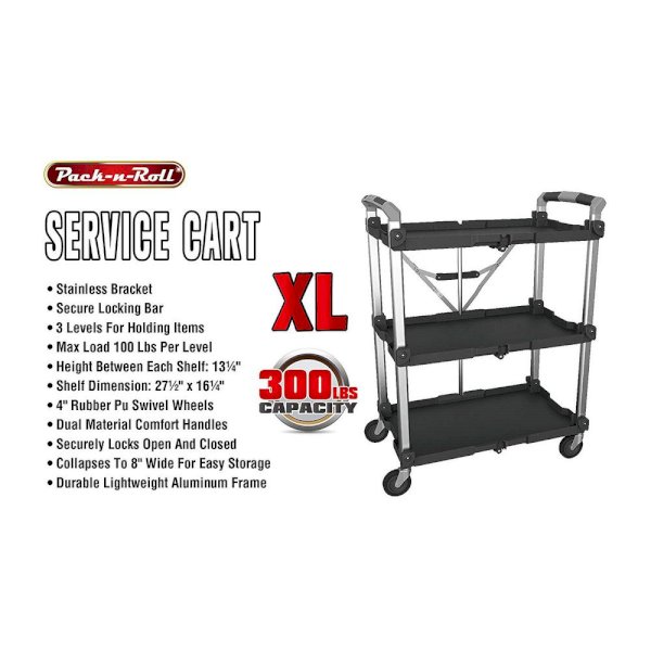 OLYMPIA Tools Pack-n-Roll Service Carts have 3-levels and collapse to 8 in. W for easy storage. Manufactured with a durable, lightweight aluminum frame, OLYMPIA Tools Pack-n-Roll Service Carts feature comfort handles, a secure locking bar, rubber swivel wheels and a sleek modern design. Perfect for use on a job site, in school, office, library, restaurant, catering, garden, home, garage and more.