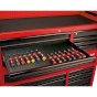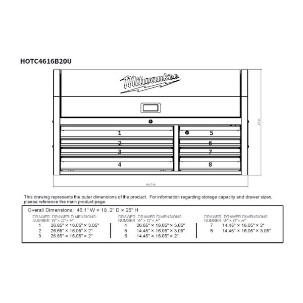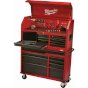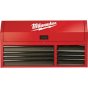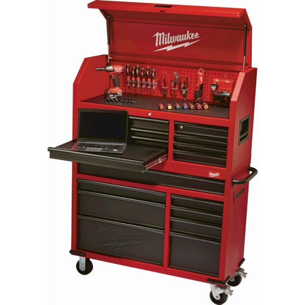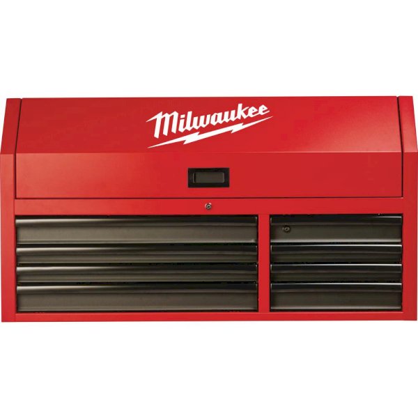Keep your garage neat with the Milwaukee 46 in. 8-Drawer Storage Chest in Red. Designed to provide increased durability and reliability, it is built with a heavy-duty 20-Gauge all-welded steel construction, ideal for professionals looking for quality and functionality. This Milwaukee storage chest has a textured gloss powder coating to increase resistance to corrosion, weather and staining. It has a lid that features gas struts for extra safety when opening and closing. It features 8-drawers - 4-small and 4-large and features a total holding capacity of 12,063 cu. in., offering you plenty of storage for all your tools. Perfect for accessing your tools and equipment, this professional tool chest is designed with ball bearing slides that can hold up to 100 lbs. so it will accommodate heavy loads. This Milwaukee storage chest has a power tool drawer with an outlet to provide the electricity you need to get the job done. Ideal for any project, it is made with an internal power supply and battery pack to keep your tools charged and ready for use. This storage chest features an internal locking system with 2-keys, which can be secured in order to protect your tools after usage. Designed to take up less space, it is built with 2-recessed handles, so you can place it in any corner of your workshop. Stay neat and organized during every project with the Milwaukee 46 in. 8-Drawer Storage Chest in Red.