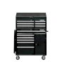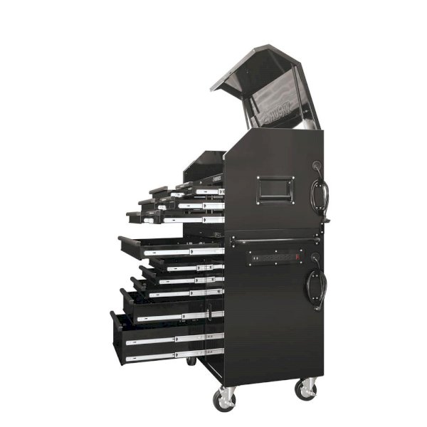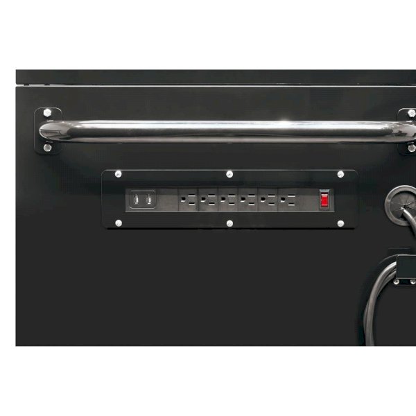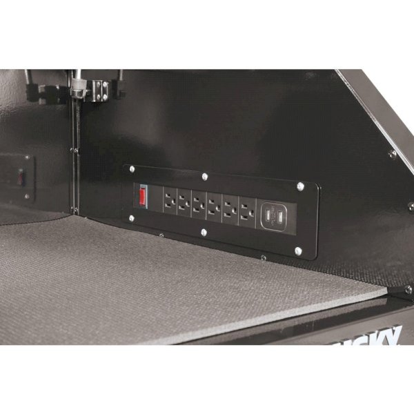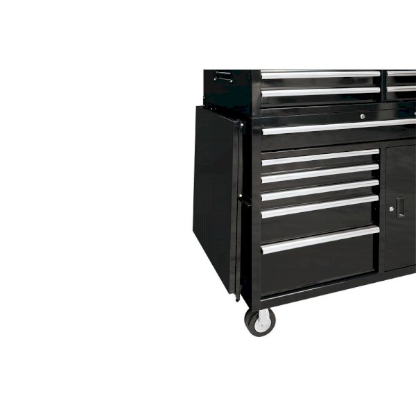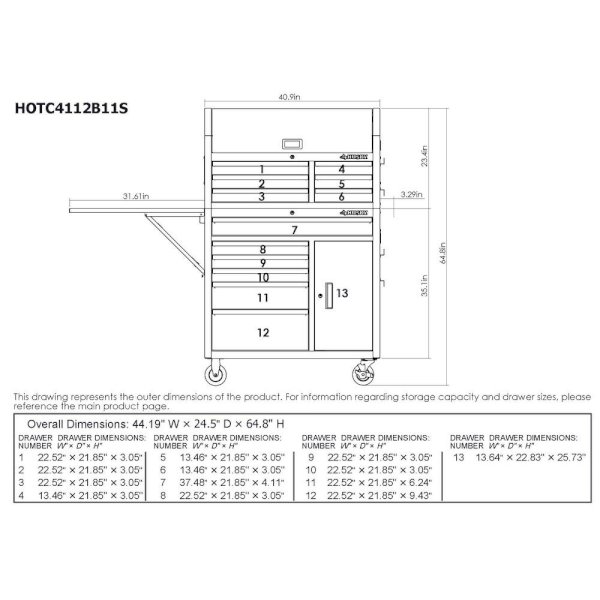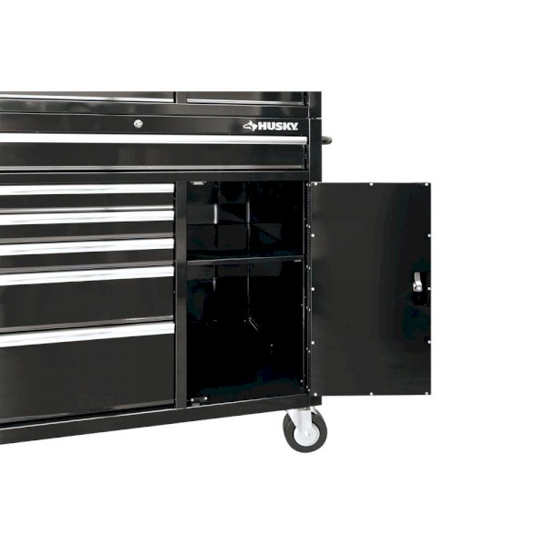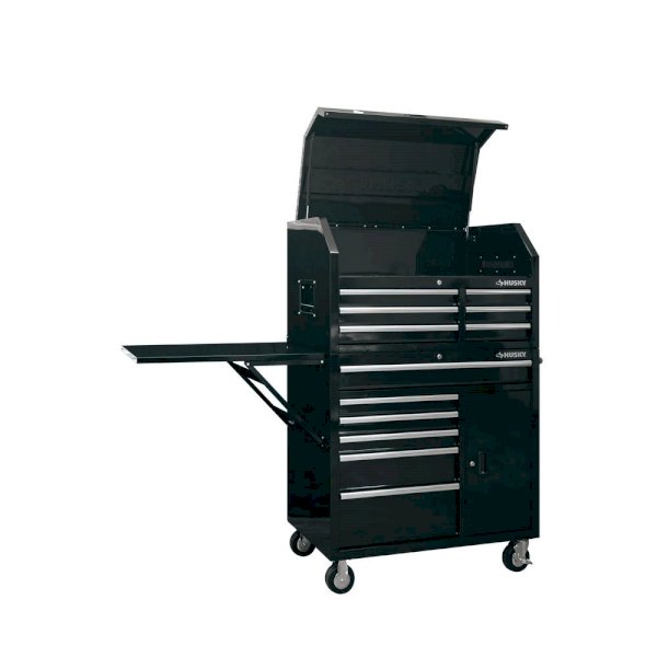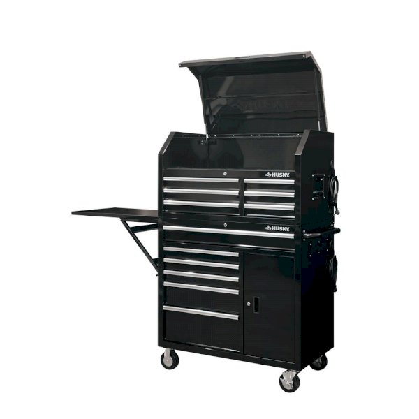 The Husky 41 in. 12-Drawer Tool Chest and Cabinet Set with extendable side table is constructed of heavy-duty, 21-Gauge steel for a professional feel. The top lid is 9.5 in. H, which is tall enough to store most power tools. This unit is 24.5 in. D and equipped with a power center on the side of cabinet with 6-outlets and 2 USB ports. There is also a hole punch-out in the rear of the chest, which allows you to run your personal power cord from a power outlet to your charging stations while still keeping your tools locked and secure in the lid. The clamshell lid includes a Husky embossed lid stiffener and gas struts for ease in opening and closing. The internal chest lock allows the drawers to conveniently function, even while the chest lid is closed. This unit has 35,887 cu in. storage capacity and 1,200 lbs. total weight capacity. It also includes a extendable side table that raises for even more work space and has 100 lbs. load capacity. This tool combo offers 12-Drawers with varying sizes to accommodate your tool storage needs. The bottom drawer is equipped with double 100 lbs. drawer slides to accommodate larger and heavier items.