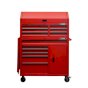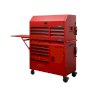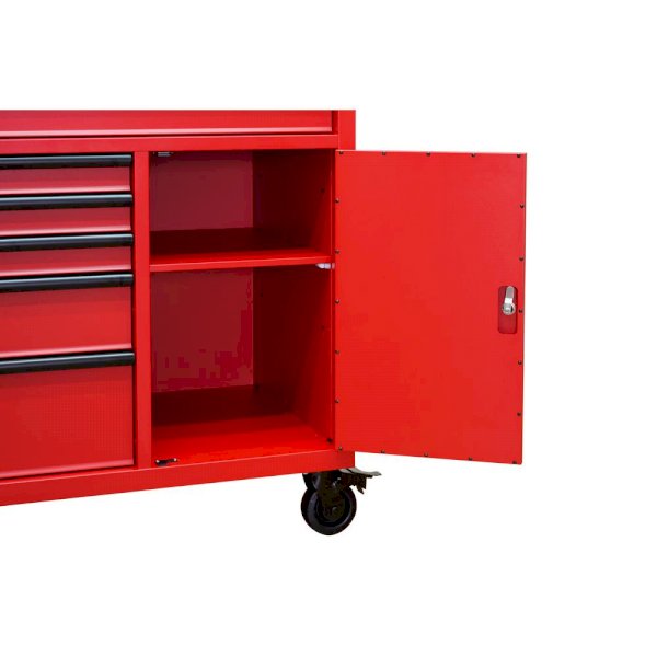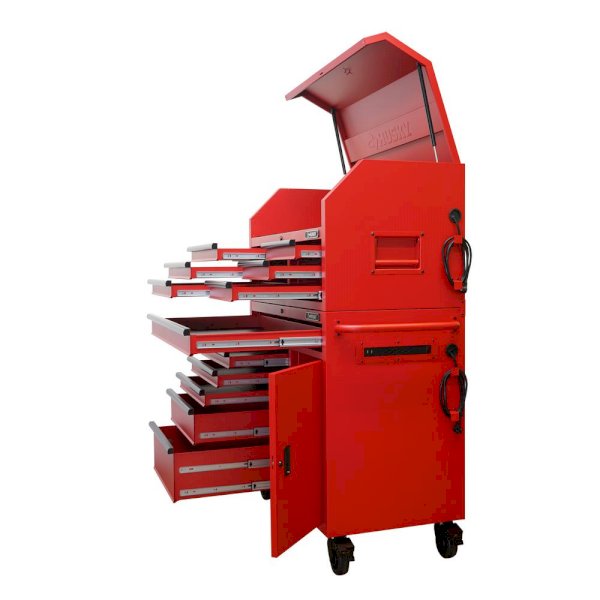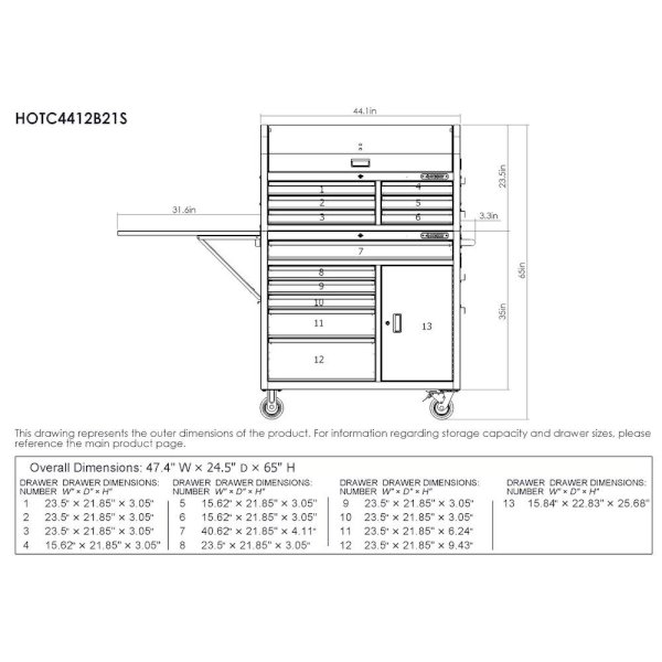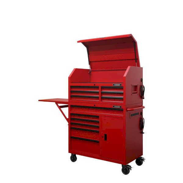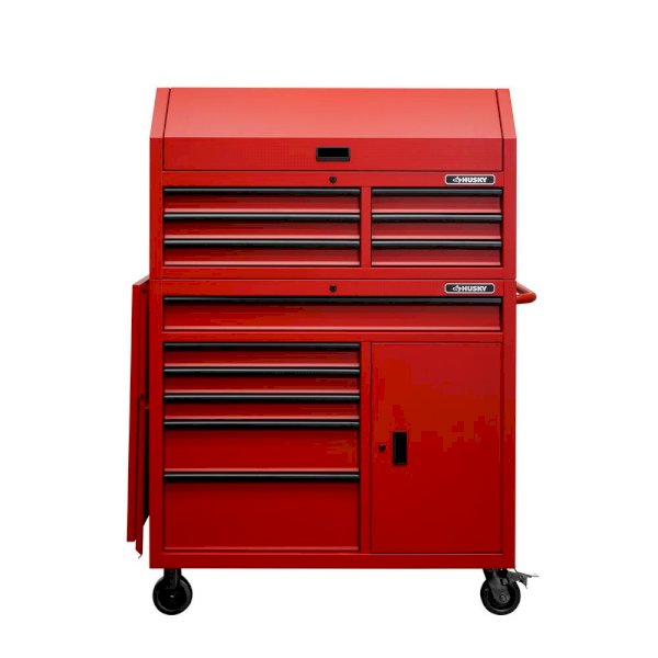 The Husky 44 in. 12-drawer 24.5 in. D extended depth tool chest and cabinet set is a heavy-duty, 20-Gauge steel, tool storage unit that is rated for 2,000 lbs. loading capacity. This tool chest and cabinet set with 12 drawers and 1 Door provide 39,389 cu. in. of storage. The heavy-duty drawers are rated to 120 lbs. each. The extra deep bottom drawers have double 120 lbs. glides. The full length drawer provides convenient storage for longer items and the small drawers keep smaller items in a confined space. Drawer liners are included to protect and keep your tools in place. There are 2 power centers with 6 outlets and 2-USB ports, making it easy to keep all of your tools charged. Also included is a extended side table on the side of the cabinet that folds up for a workstation and has 100 lbs. load capacity. For added security, both the chest and cabinet are fitted with a barrel key lock system. This toolbox weighs in at 471.6 lbs. This unit is easy to roll around with the heavy-duty 5 in. x 2 in. industrial grade casters.