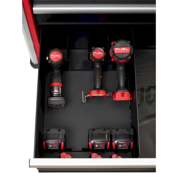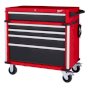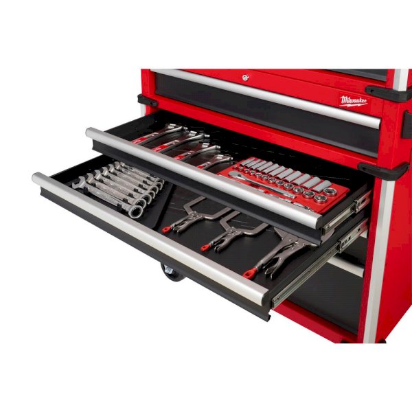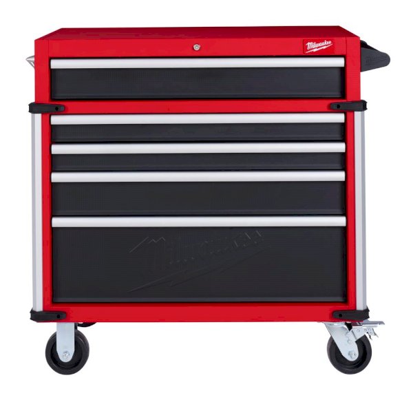 The 22 in. D Milwaukee 36 in. 5-Drawer Tool Cabinet boasts a large 15,274 cu. in. of storage capacity and can hold 1,800 lbs. The rolling cabinet features a 4.5 in. D top drawer to easily access your deep socket sets and a 9.5 in. D bottom drawer with a removable power tool organizer, for easy management of your various power tools and battery packs. Mount your Milwaukee battery chargers to the side wall and charge your batteries with the built-in, 6-outlet/2USB power center. The 100 lbs. rated, soft-close, ball bearing drawer slides gently retain the drawers from accidental opening or slamming shut. This tool box also includes a Milwaukee stainless steel bottle opener and stylish aluminum edge guards with rubber corner bumpers to help protect your investment. The red and black textured finish is rugged, durable, and stands up to harsh environments. Combine with the Milwaukee 36 in. 7-Drawer Tool Chest, model# 48-22-8538 for a total storage capacity of 27,326 cu. in.