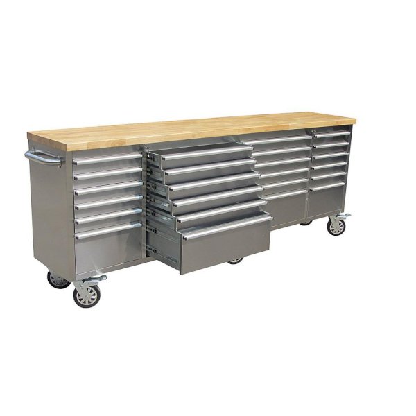 Increase your storage space and functionality of your work area with the 96 in. stainless steel rolling tool chest w/ 24-drawer. With a modern look and the durability of stainless steel, these cabinets will help you stay organized. This high-quality mobile workbench is designed with ball bearing slides that can hold up to 100 lbs. to accommodate heavy loads.