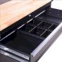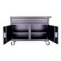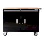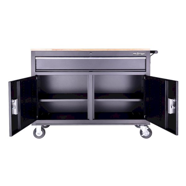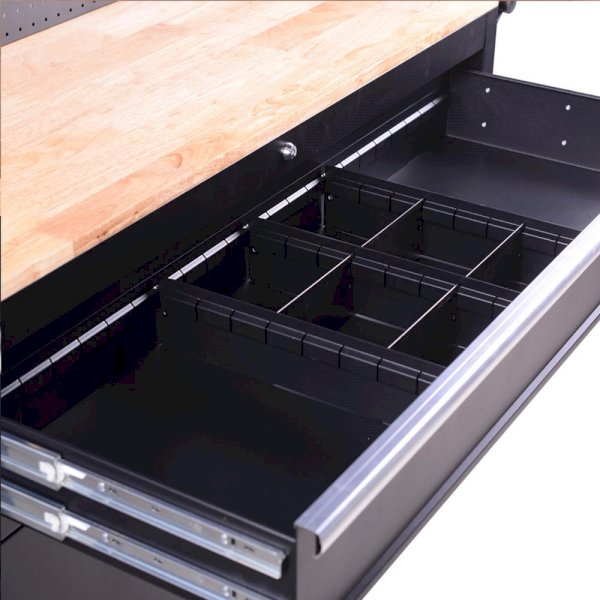 This 46 in. steel cabinet has 1 upper drawer and 2 lower doors with shelves on each side. Includes double heavy-duty drawer slides with a high load capacity of 200 lbs. Built in drawer divider system for small parts and wooden work surface.