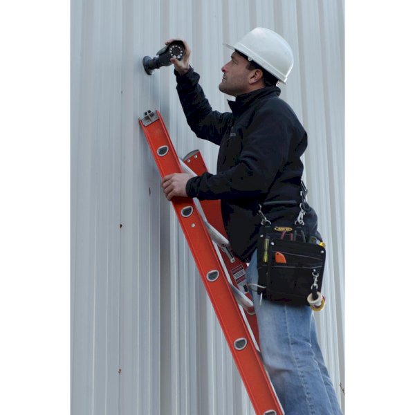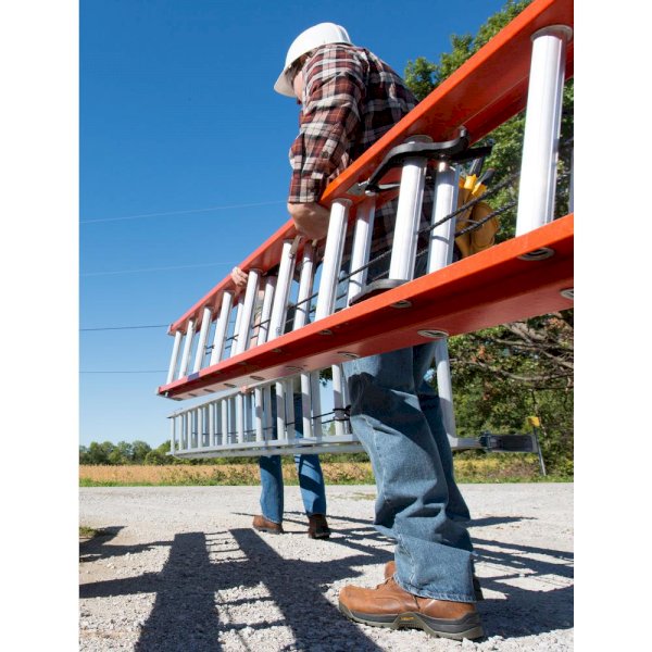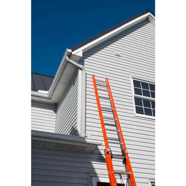 This Louisville 28 ft. fiberglass extension ladder has a 300 lbs. load capacity, rated ANSI Type IA. It is equipped with the MAXLOCK rung lock, custom engineered from a patented, advanced molecular polymer, MAXLOCK is the strongest, toughest, lightest rung lock ever made. This ladder also includes the patented QuickLatch system that provides a simple, intuitive method of securing the fly and base sections of the ladder when extended. The ladder features outside slide guides, D-shaped rungs fully serrated for a slip resistant surface, non-marring rail end caps, rope and pulley and steel swivel safety shoes with metal shield to be used with the tread down or in spike position. The Louisville FE3228 fiberglass extension ladder meets or exceeds the safety standards set by ANSI, CSA and OSHA.
