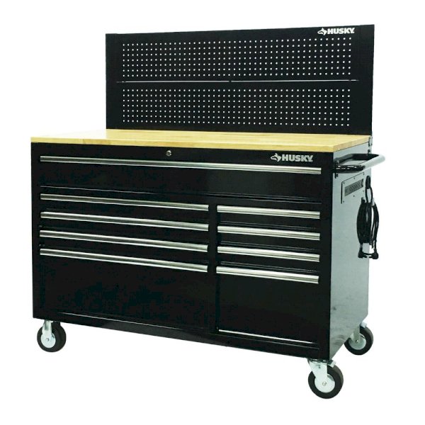 52 in. W 9-Drawer, Deep Tool Chest Mobile Workbench in Gloss Black with Pegboard