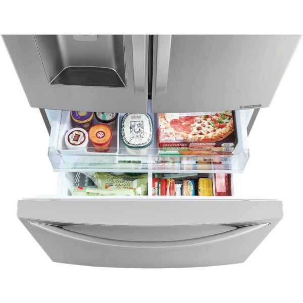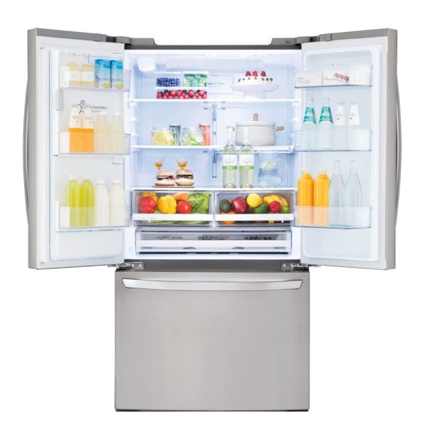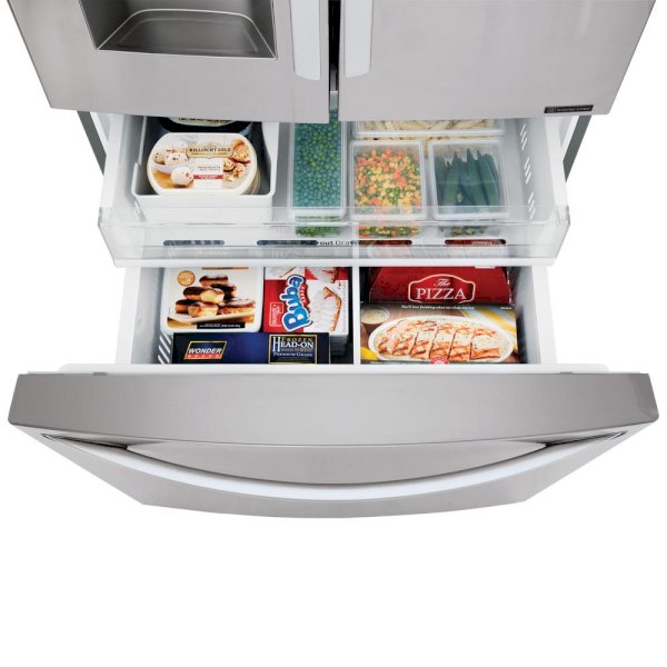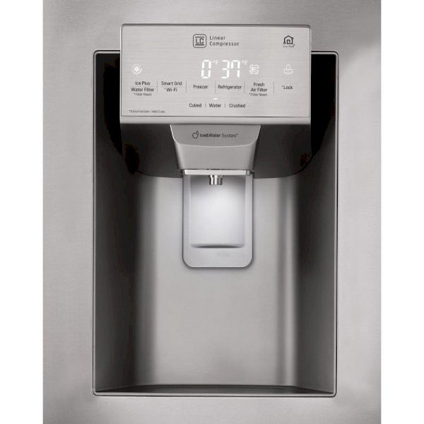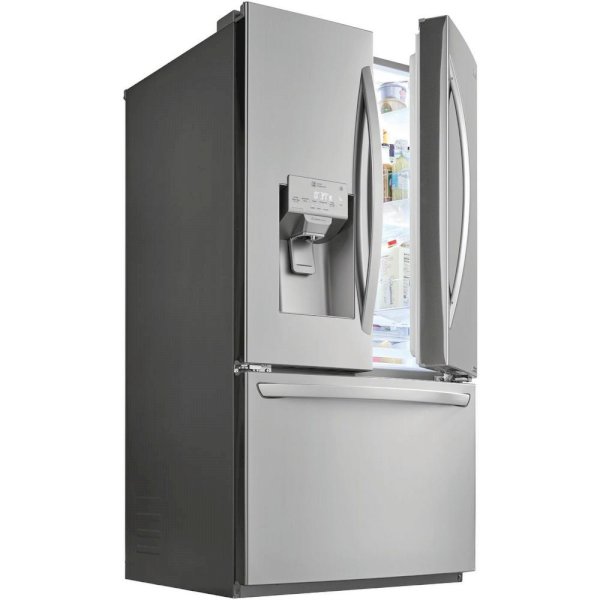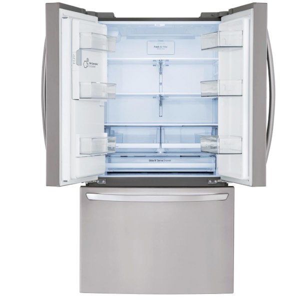 At nearly 28 cu. ft., you get extra space. The Slim SpacePlus ice system provides ice while freeing up even more room in the door. And with French doors, it's real easy getting food in or out of this refrigerator. This refrigerator's Linear Compressor motor uses fewer moving parts and operates more efficiently and LG confidently backs the motor with a 10-year warranty, giving you peace of mind.