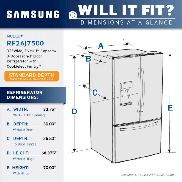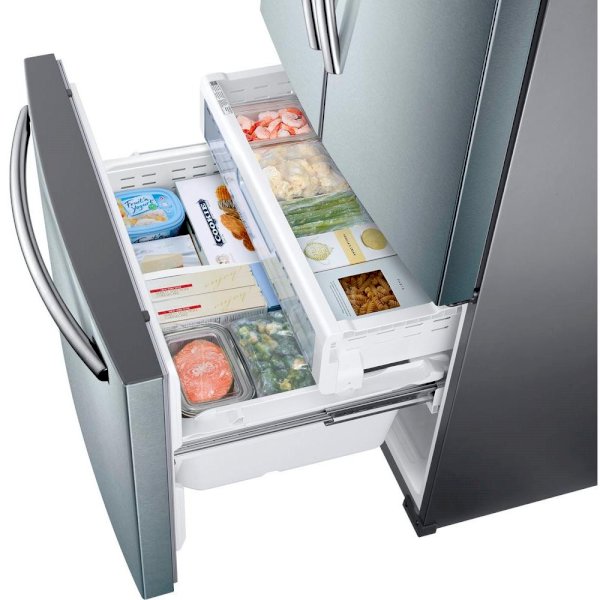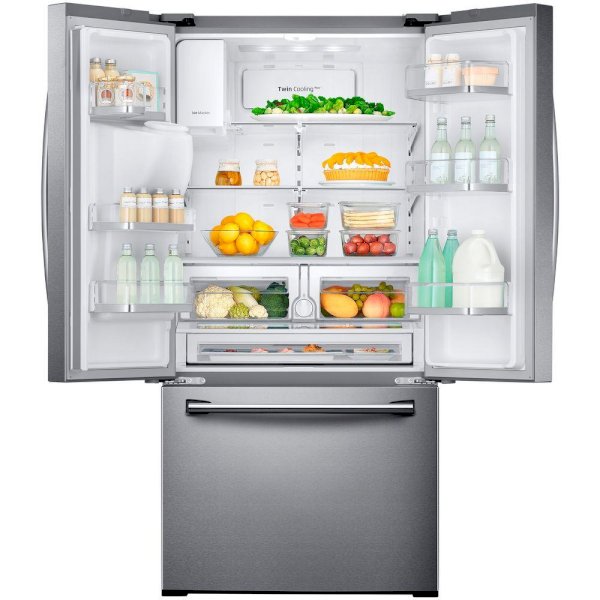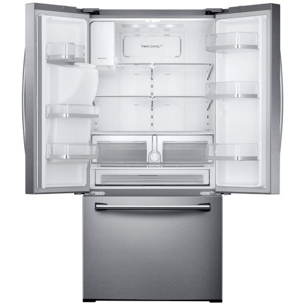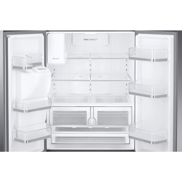 This Samsung 26 cu. ft. French door refrigerator stores up to 26 bags of groceries in a sleek 33"-wide model. Twin Cooling Plus locks in freshness while CoolSelect Pantry provides optimal temperature control for you food storage needs. Plus, Ice Master ice maker, , and more.