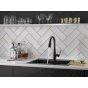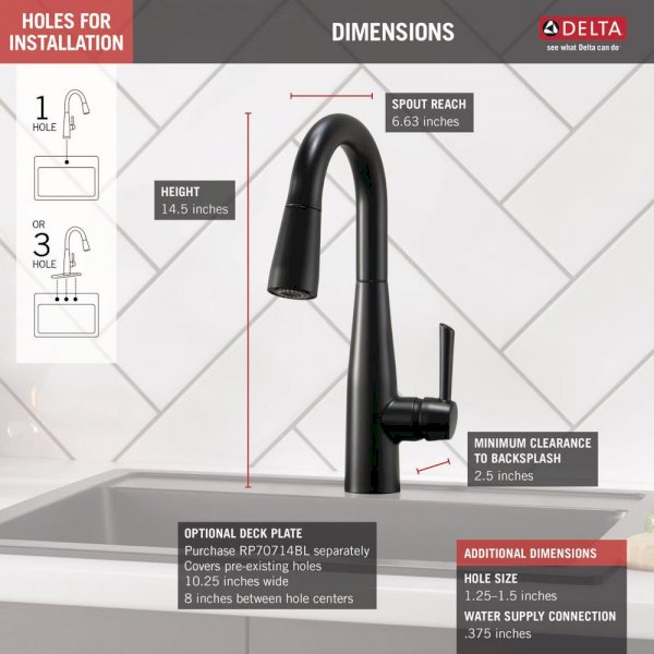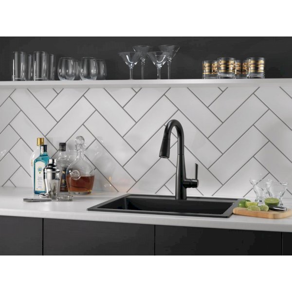 This Essa Single-Handle Bar Faucet in Matte Black with MagnaTite Docking features a soft contemporary take on a euro design with subtle detailing accents that allow the faucet to blend with contemporary and transitional design. The pull-down spray wand comes free with a gentle tug and gives you total flexibility. The hose extends and retracts without friction points, fed by gravity. As you raise the wand to dock it, the magnet embedded in the spout pulls the wand precisely into place. So, unlike other pull-downs that tend to droop over time, MagnaTite keeps your pull-down faucet looking picture-perfect. Delta's exclusive DIAMOND Seal Technology uses a valve with a tough diamond coating. InnoFlex PEX waterways keep water inside the faucet out of contact with potential metal contaminants. This powerful combination brings you a faucet built to last up to 5 million uses. Only Delta faucets are equipped with Touch-Clean soft, rubber nubbins that allow you to easily wipe away calcium and lime build-up with the touch of a finger.