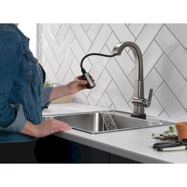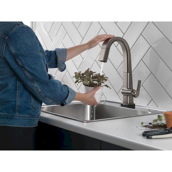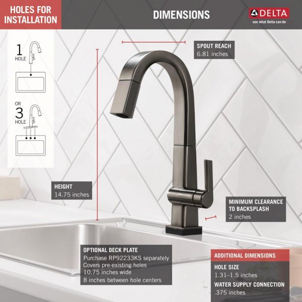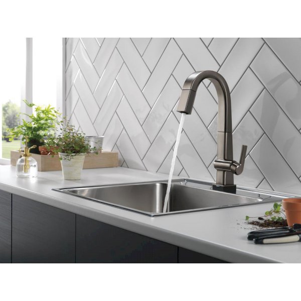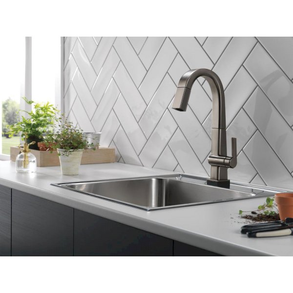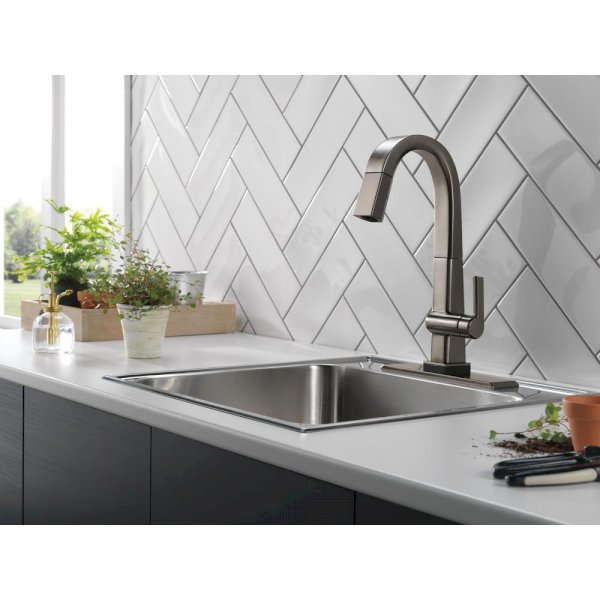 The confident slant of the Pivotal Collection makes it a striking addition to your kitchens contemporary geometry for a look that makes a statement. Touch it on. Touch it off. Whether you have two full hands or 10 messy fingers, Delta Touch2O Technology helps keep your faucet clean, even when your hands aren’t. A simple touch anywhere on the spout or handle with your wrist or forearm activates the flow of water at the temperature where your handle is set. The Delta TempSense LED light changes color to alert you to the waters temperature and eliminate any possible surprises or discomfort. Delta MagnaTite Docking uses a powerful integrated magnet to pull your faucet spray wand precisely into place and hold it there so it stays docked when not in use. Delta faucets with DIAMOND Seal Technology perform like new for life with a patented design which reduces leak points, is less hassle to install and lasts twice as long as the industry standard. You can install with confidence, knowing that Delta faucets are backed by our Lifetime limited warranty. Electronic parts are backed by our 5-year electronic parts warranty. Industry standard is based on ASME A112.18.1 of 500,000 cycles.