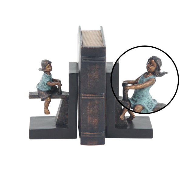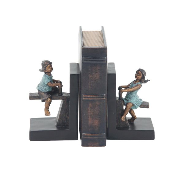 This lovely pair of polystone bookends offers convenient and stylish organization options for homes and offices. It features two L-shaped platforms designed with detailed boy and girl figures on a seesaw. Donning a textured finish and a unique color scheme of blue, brown, tan and black tones, it makes a fine addition to farmhouse-themed settings.