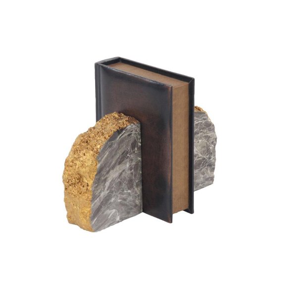 Set of gray marble bookends with geode stone texture and metallic gold accent