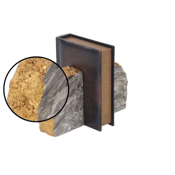 Large split sphere faux thunder egg chunks with shiny gray and white marble interiors and metallic gold rough exteriors, inspired by natural lava thunder eggs; flat edges firmly keep books upright