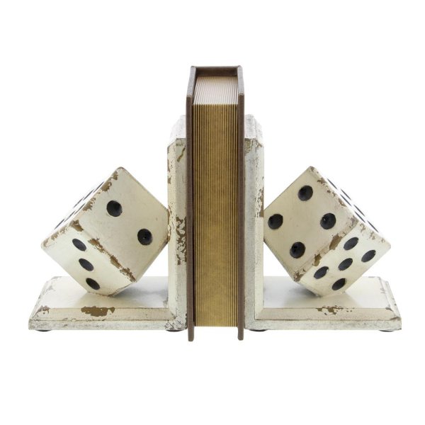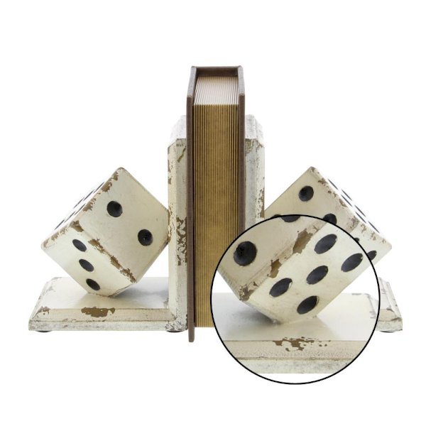 Pair of 8" Vintage Reflections rustic wood-style mdf tumbling dice bookends, distressed and chipped off-white paint over walnut-finish mdf L-shape bookends, beveled edges with squared corners, cattycornered white dice poised on tips, sunken black pips