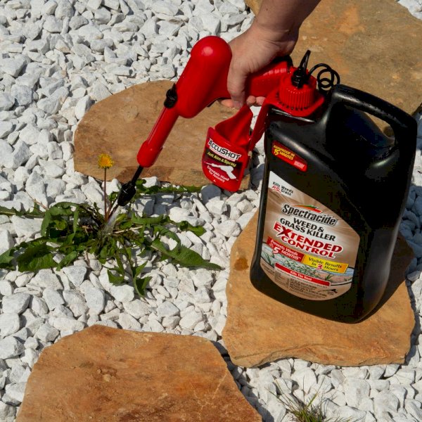 Spectracide Weed & Grass Killer With Extended Control with the AccuShot continuous power sprayer is a ready-to-use weed killer plus preventer that prevents weed growth for up to 5 months. This quick-kill formula acts fast to kill all types of weeds and grasses down to the root, for visible results as fast as 3 hours. This product is rainproof in 15 minutes – rainfall or watering 15 minutes after application will not wash away effectiveness. Spectracide Weed & Grass Killer With Extended Control works the first time, every time! Use along fences, paths, patios, sidewalks, curbs and driveways and around established ornamental trees, shrubs, flower beds, plantings and buildings. Use for trimming and edging landscapes. Treated areas can be replanted one day later. For best results, apply in warm, sunny weather when the temperature is over 60 degrees. Do not use in areas that will be planted or seeded within 3 months. See label for complete instructions. The AccuShot sprayer allows for continuous spraying and precise application. It features a comfortable, ergonomic grip and an extendable wand that makes it easier to target only the weeds you want to kill. In addition, it features a one-touch continuous spray that requires no repetitive squeezing, pumping or pulling. The AccuShot sprayer is reusable – keep it for use with Spectracide Weed & Grass Killer With Extended Control.