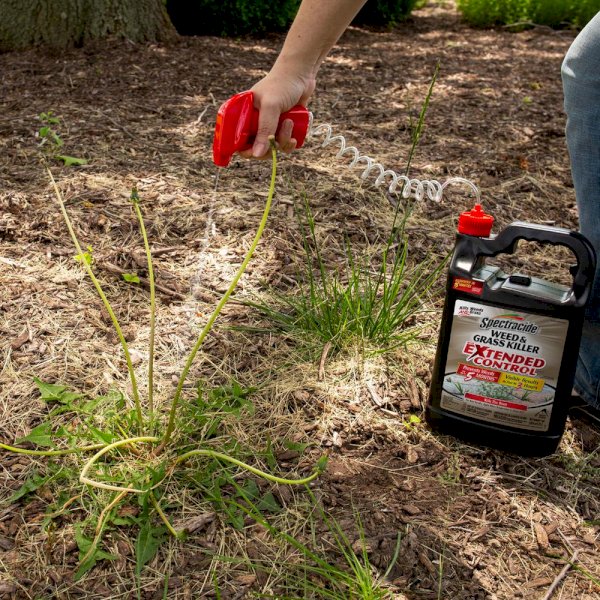 Spectracide Weed & Grass Killer With Extended Control is a ready-to-use weed killer plus preventer that prevents weed growth for up to 5 months. This quick-kill formula acts fast to kill all types of weeds and grasses down to the root, for visible results as fast as 3 hours. This product is rainproof in 15 minutes – rainfall or watering 15 minutes after application will not wash away effectiveness. Spectracide Weed & Grass Killer With Extended Control works the first time, every time! Use along fences, paths, patios, sidewalks, curbs and driveways and around established ornamental trees, shrubs, flower beds, plantings and buildings. Use for trimming and edging landscapes. Treated areas can be replanted one day later. For best results, apply in warm, sunny weather when the temperature is over 60 degrees. Do not use in areas that will be planted or seeded within 3 months. See label for complete instructions.