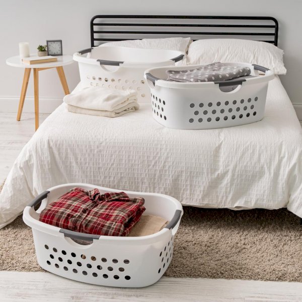 Carry your laundry in comfort with this durable plastic laundry basket with hip curve design. The 1.4 Bushel, 48 Liter clothes hamper provides plenty of laundry storage to minimize the number of trips you have to make. The smooth curve of the clothes basket rests comfortably against the hip for easy carrying to and from the laundry room. Three durable, easy grip handles allow for carrying the basket any way you need, and the sturdy plastic clothes hamper keeps its shape as you pile clothes in. Set of three.