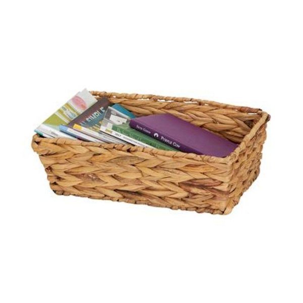 Household Essentials Water Hyacinth Wicker Decorative Storage Baskets are beautiful, hand-woven decorative storage baskets made from warm water hyacinth. The leaf is expertly woven around a metal frame for a sturdy, stable, and attractive basket. This set of 4 baskets comes with 3 sizes of baskets: large, medium, and small (2). The set is left its natural golden color and is perfect for organizing your space--from countertops to drawers to shelving. These boxes are sized for small storage. Keep a few in the bathroom for cotton balls or hair supplies; use them as napkin holders for outdoor barbeques and picnics! Any place you have things to collect, a beautiful wicker bowl can be on hand as an attractive solution to the life's clutter. The large basket measures h inches high, 16. 5 inches wide, and 12.5 inches deep. The medium basket measures 4.5 inches high, 14 inches wide, and 11 inches deep. The 2 small baskets each measure 3.5 inches high, 8.5 inches wide and 6.25 inches deep.