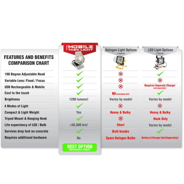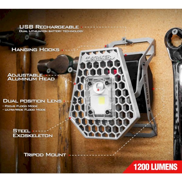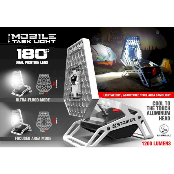 The STRIKER Mobile Task Light is a rechargeable mobile task light that is designed to be lightweight, durable, easily packed, and flood a room, work area, or campsite with usable hands-free light. This 1200 lumen Mobile Task Light has an aluminum head that is adjustable 180° and designed as a functional heat sink, ensuring it is always cool to the touch. In addition, the light array can be directed by the variable lens to either produce a wide flood of light, or a more focused flood array. Hang it, hook it, or utilize the tripod mount to elevate the light. With USB recharging, this multi-mode light is perfect for any situation.