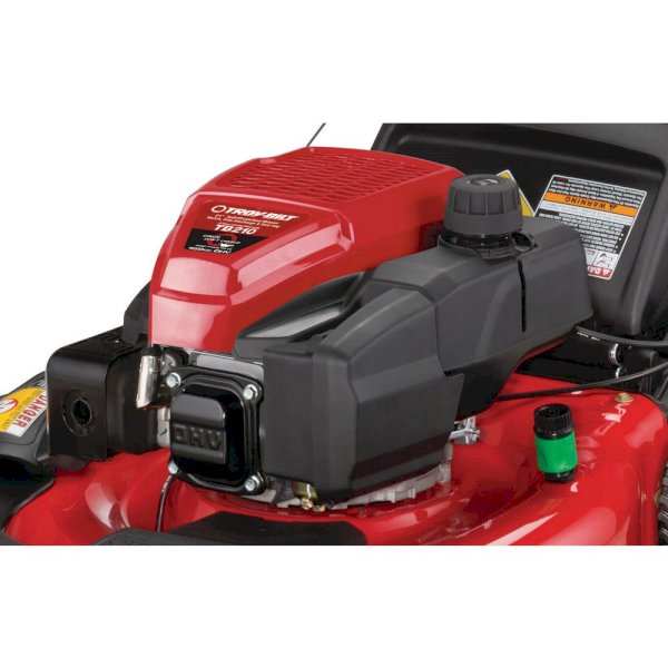 Eliminate oil changes on the Troy-Bilt TB210 self-propelled mower with innovative Troy-Bilt OHV engine with Check, Don't Change system. Simply check the oil each time and top off as needed, reducing maintenance time and having to dispose of old oil. Variable speed front wheel drive improves control and allows for faster turning while mowing. With rear bag, mulch kit and side discharge options included, you have a choice for disposing of grass clippings. Dual-lever height adjusters are conveniently located to quickly adjust the cutting height and the TriAction cutting system uses a rake guard, symmetrical deck and specialized blade to deliver a clean, even cut every time. You can depend on Troy-Bilt to keep yardwork from feeling like a chore, and we won't let you down.