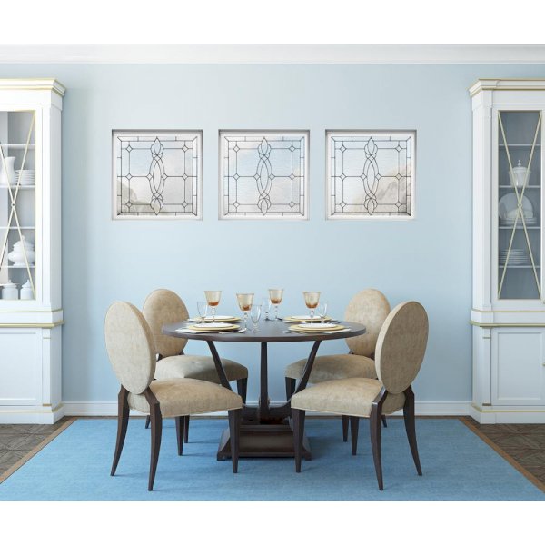 Visually appealing decorative glass option adds beauty and elegance to any room where privacy and natural light are desired. Lightweight and easy to install, decorative glass is a great alternative to expensive window coverings and is available in a variety of sizes, shapes and styles such as casements, awnings and geometric shapes as well as the traditional fixed picture windows. Black patina and satin nickel camings options available.