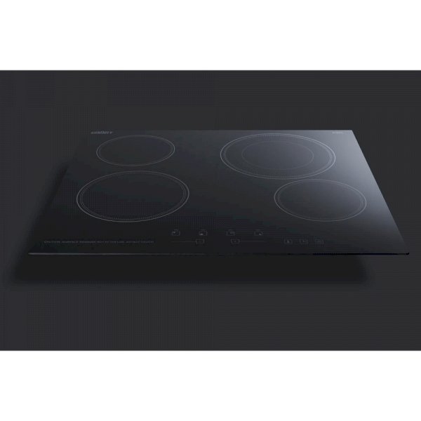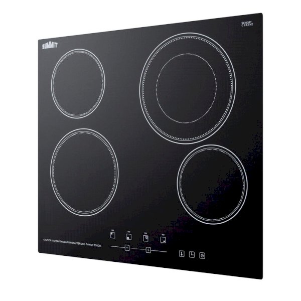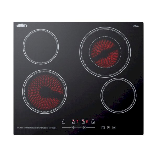 SUMMIT's collection of smooth-top radiant cooktops offers an easy-to-clean design with modern style built for smaller kitchen spaces. The CR4B23T5B is a 24 in. wide 230-Volt radiant cooktop designed to fit popular 22 in. W x 19-1/2 in. D counter cutouts. The surface is made from smooth Schott ceramic glass in a jet black finish for a durable, modern look. This unit does not ship with a power cord and must be hard-wired by a professional. Unlike many other 24 in. wide cooktops, the CR4B23T5B includes an extra large 2200-Watt 8 in. element to accommodate large cooking vessels and offer faster heating when boiling water. For added versatility, this dual zone element can also be used at a 5 in. Dia for smaller pots and pans. The front right and rear left 5-1/2 in. elements cook at 1200-Watt, while the front left zone is 7 in. wide with an 1800-Watt operation to handle larger meals. The digital touch controls are located in the front for easier accessibility, preventing users from reaching over hot burners when cooking. The temperature is easy to adjust at the touch of a button, with 9 power levels for each burner. This unit also includes a timer function that lets you program a power level and cook time (up to 99 minutes). The burner turns off automatically when the cooking duration has finished. Safety features include a child lock function, automatic shutoff after 2 hours, and residual heat indicators for all 4 elements.