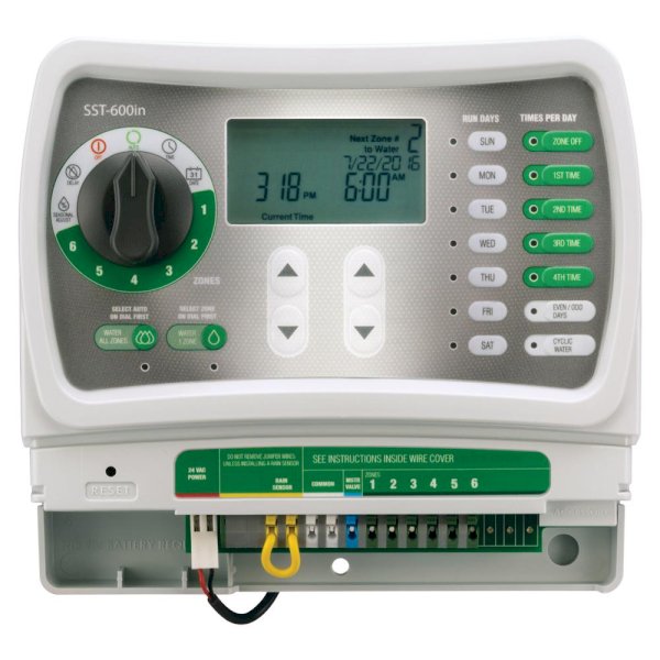This indoor-mounted timer is so easy to use you can forget the instructions. Its intuitive zone-by-zone scheduling allows you to set watering times differently for each area of the yard, providing greener results with less water. By turning the dial to each zone, you can easily set custom days of the week, odd or even days, or a cycle number of days independent of all other zones. You can also set up to four different custom watering times of the day to water slopes and clay soils in short intervals to allow water to soak in and avoid runoff. Each zone's settings can be reviewed quickly with easy to read LED indicator lights.