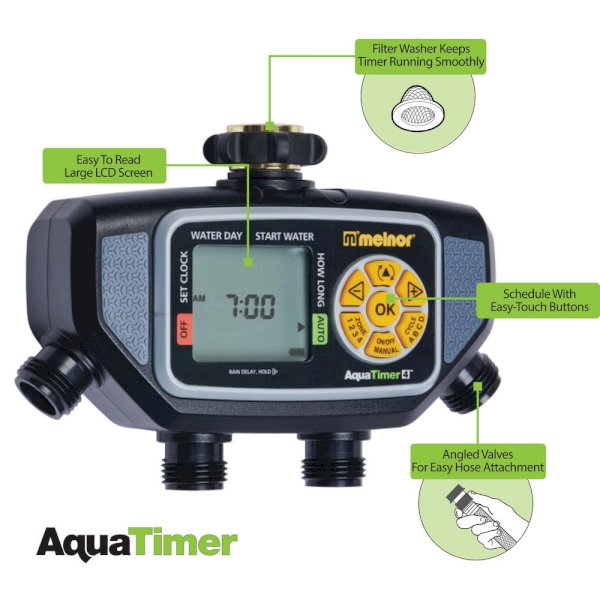 Nourish several areas of your yard with this four-zone electric water timer. Featuring four high-flow valves to water four areas, you can easily select four separate start times on each valve. The timer's rain delay function helps you avoid wasting water by pausing the water for up to seven days. The angled-valve design makes it easy to attach this water timer to multiple hoses with no harm to your knuckles. Each zone works like a separate timer, so the tomatoes and squash can be watered every morning while the lawn sprinkler comes on every few days.