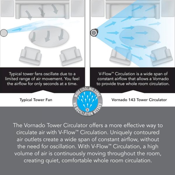The 143 Tower Circulator by Vornado offers Vornado’s signature V-Flow Circulation in a compact size. Uniquely contoured air outlets create a wide span of constant airflow, without the need for oscillation. Typical tower fans oscillate due to limited range of air movement. You feel the airflow for only seconds at a time. With V-Flow Circulation, a high volume of air is continuously moving throughout the room, creating quiet, comfortable Whole Room Circulation. The 143 features a remote control that magnetically cradles at the top of the unit, so the remote is always in reach. 3 Speed settings, selected by push-button controls, allow you to tailor the airflow perfectly for your needs. The 143 Tower Circulator includes a 1, 2, 4, or 8 hour timer ensures you run you operate in an energy-saving, efficient way. Vornado has eliminated the wobbly base found on oscillating tower fans in favor of a solid and sturdy system that stands the test of time. Like all Vornado Whole Room Circulators, the 143 is backed by an industry-leading 5-year warranty. Standing 29 tall.
