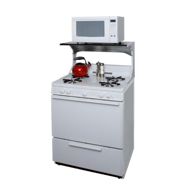 The Premier 30 in. White Top Shelf is a space saving dream. Top Shelf has the strength and stability to support a microwave or small appliance weighing up to 80 lbs. The textured steel shelf offers an attractive, durable surface, while the stainless steel heat deflector aims cooktop heat back down and away from the shelf. Top Shelf assembles quickly and is installed by simply slipping it over the backguard to securely rest on the range cooktop retainer edges, with no attachment required.
