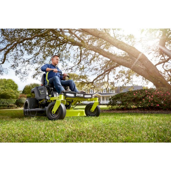 It's time to turn away from gas and towards the RYOBI 48V Zero Turn Electric Riding Mower. Powered by 100 Ah Batteries and 4 High-Powered Brushless Motors, this mower can cut up to 3 acres on a single charge. The durable 42 in. steel deck is equipped with two precision cut steel blades. Combined with aggressive zero turn technology, the 12-Position Manual Deck Adjustment provides a clean cut to your lawn every time. The advanced control panel activates the blades, slow speed function, LED headlights, and displays the battery level and run-time. The rear access charging port makes charging your rider easy when the job is done.