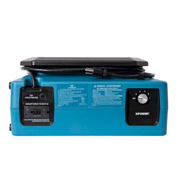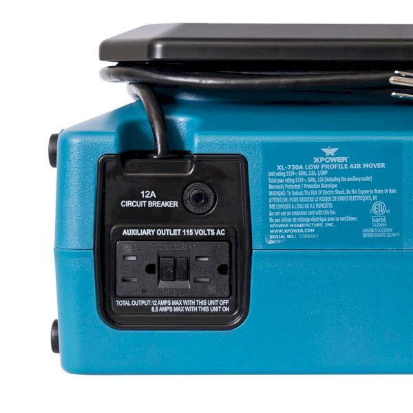 The XPOWER XL-730A Low Profile Air Mover features powerful ventilation in a compact size that does not compromise on power. A sealed 1/3 HP motor and large intake area generate a high volume of extended airflow which has the velocity to maximize drying area efficiently. Strategically placed vents on the underside of unit dry surface below the fan. The XL-730A's durable ABS plastic housing is built with heavy commercial use in mind. Offering 5 adjustable speeds and built in daisy chainable GFCI power outlets makes this unit versatile for a variety of drying applications. Stackable up to 6 units high, the XL-730A features a slim profile that is the most compact in its class. A deep nested stackable design allows for stable transportation. Unit can be positioned horizontally or vertically for drying and storage. A lightweight design and ergonomically positioned molded handle makes the XPOWER Low Profile series of air movers the new industry favorite.