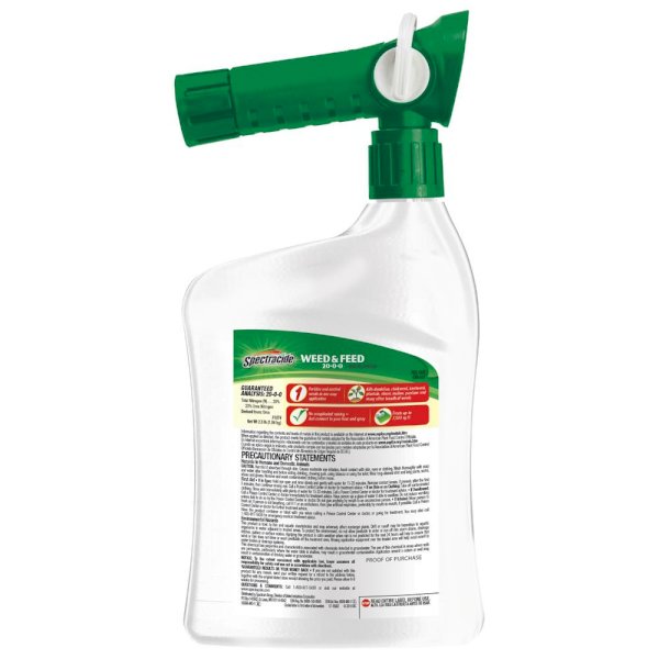 Spectracide Weed and Feed 20-0-0 lets you fertilize and control weeds in 1 easy application. No complicated mixing just connect to your hose and spray with the QuickFlip hose-end sprayer. Controls major broadleaf weeds, including dandelion, chickweed, knotweed, plantain, clover, mallow, purslane and many others as listed. Treats up to 7,500 sq. ft. of lawn. Spray Spectracide Weed and Feed 20-0-0 any time during the growing season when weeds are actively growing. Thoroughly water your lawn 1 to 2-days before treating, but avoid watering within 24-hours after applying for best results. If certain tough weeds are not dead within 3-weeks, spot treat. It will take about 20-minutes to empty the bottle, although actual treatment time will vary depending on water pressure.