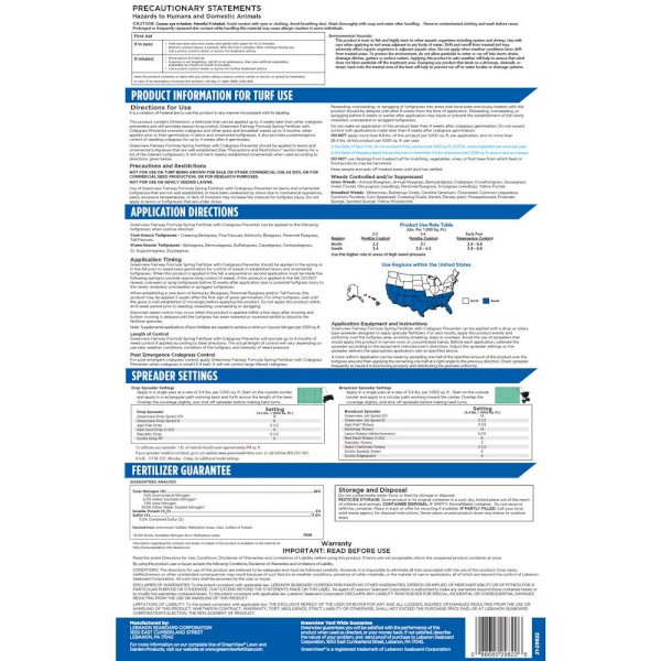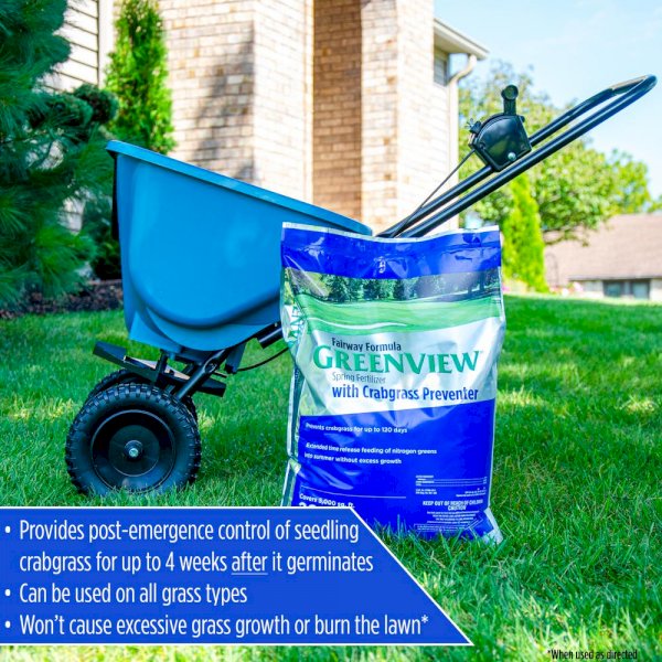 GreenView Spring Fertilizer with Crabgrass Preventer is a premium quality lawn fertilizer that toughens, greens and thickens your lawn. Plus it prevents crabgrass and other grass and broadleaf weeds (see label for a complete list) for up to 4 months when applied prior to germination in lawns. It also provides post-emergence control of seedling crabgrass for up to 4 weeks after it germinates. Special extended time-release feeding of nitrogen lasts up to 12 weeks, without surge growth. Apply this formula any time lawn is actively growing. This fertilizer works on any type of grass; will not burn lawn. Promotes a deep green turf color with fewer grass clippings. 100% customer satisfaction guarantee or money back.