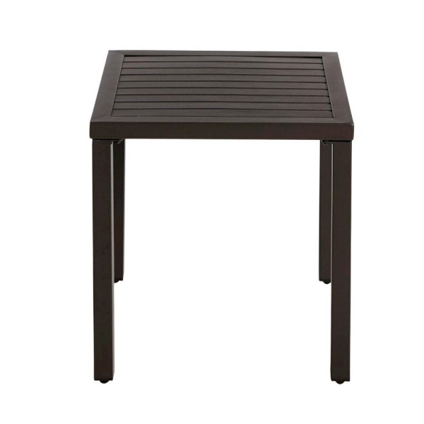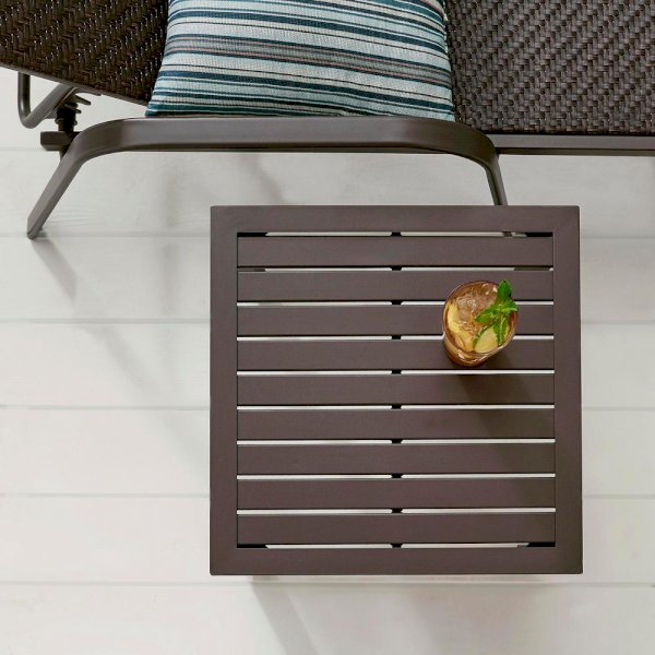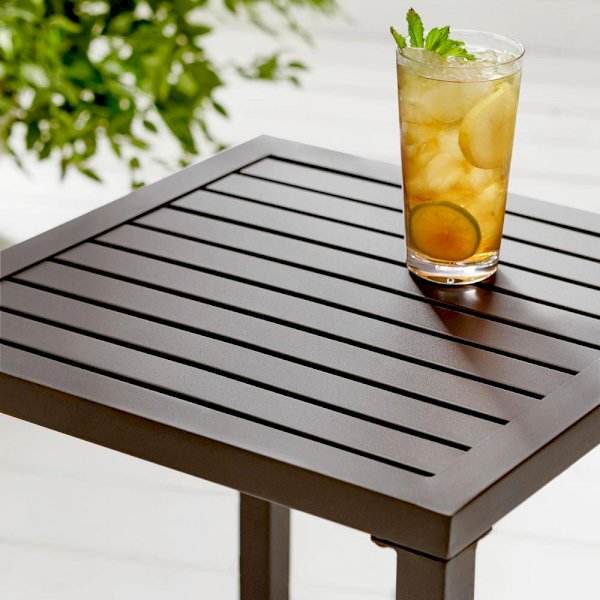 Add a stylish accent to your outdoor space with the Mix and Match Steel Slat Top Outdoor Side Table. A rust-resistant, powder coated steel frame provides durable support season after season. The slat top design is a perfect complement to most any decor. This 19 in. x 19 in. table is easy to assemble with the included tools and can be cleaned with just a damp cloth. Backed by a 2 year limited warranty.