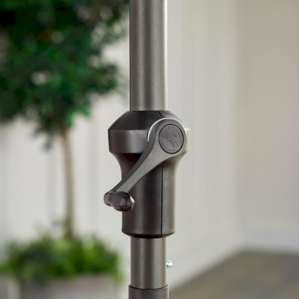 Keep cool on those hot days with the 9 ft. Crank and Tilt Patio Umbrella in Haze. The polyester fabric canopy is weather-resistant and fade-resistant. A steel frame provides reliable support and the umbrella is easy to clean with a damp cloth. A built-in tilt function allows you to position the umbrella at an angle and the crank makes it easy to close when not in use. Backed by a 1 year limited warranty.