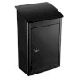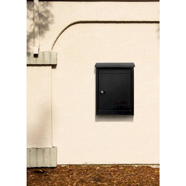 Winfield Parcel Sentry Junior top loading locking wall mount parcel mailbox features a curved soft closing lid which covers incoming parcel drop opening. Lid is raised up and a steel plate lifts inside with lid, then parcel is placed though top and drops into locking compartment when lid is closed keeping contents safe from unwanted hands. Built from thick, heavy gauge galvanized steel with a tough black powder coat finish. Locking retrieval door is fitted with a butterfly lock and comes with a set of keys. Maximum parcel size: 9 in. x 9-3/4 in. x 5-7/8 in.