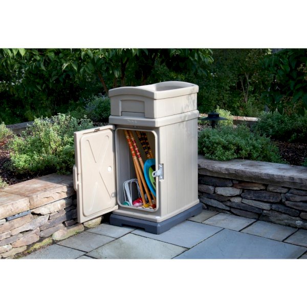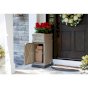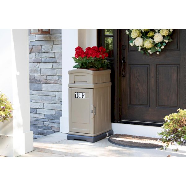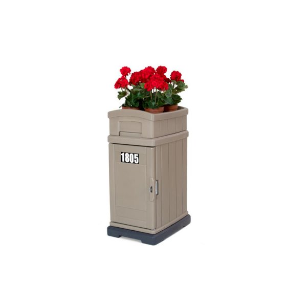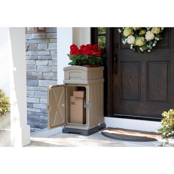 The Hide Away Delivery and Storage Box is a tough, weather resistant home package delivery and storage box with traditional styling that compliments homes while protecting and securing oversized deliveries. Heavy-duty magnetic cabinet door closes securely to ensure that ground and express deliveries are protected from the elements. Planter top for flowers and more.