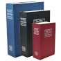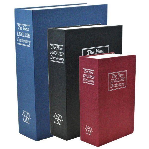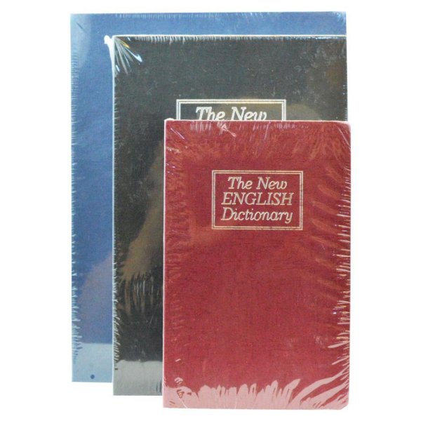 At face value this safe looks like any old boring dictionary but behold inside is a hidden surprise. That surprise is a steel lock box just waiting to keep all your small valuables safe and secure. Everyone has items they cherish and that they want to protect from would be intruders and thieves. Often times it is better to hide those things in plain sight. Thieves will be looking for an obvious safe sitting there in your closet or under your bed. Ours hides right there blending in among all your other books. Adorned with a realistic looking cover that has the same feel as a marbled cotton cover, you can be sure your hidden safe stays that way and doesn't stick out like a sore plastic thumb on your book shelf. Other faux book diversion safes may have a hard plastic cover that is obviously not a book, not ours. Includes 2 keys. Props shown in picture are not included (gun, money, keys, etc.) Set includes: Small Red Safe (OD: 2.1875 in. x 4.625 in. x 7.125 in.) Medium Black Safe (OD: 2.1875 in. x 6.1875 in. x 9.5625 in.). Large Red Safe (OD: 2.625 in. x 7.875 in. x 10.5 in. ).