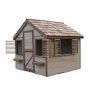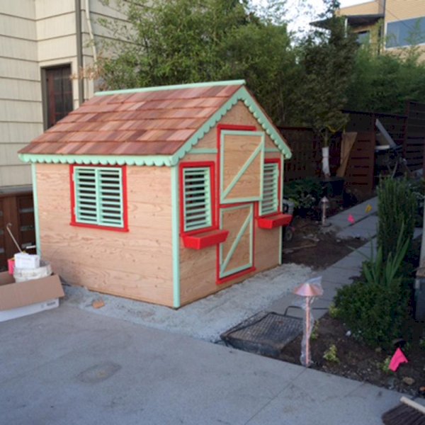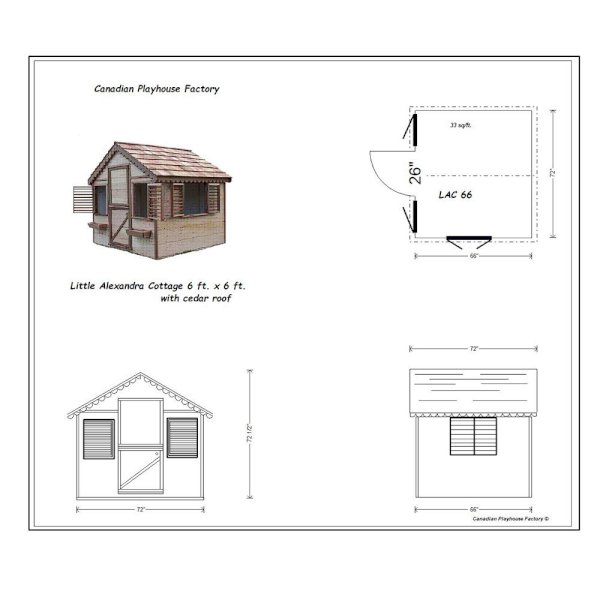This Little Alexandra is well accessorized with 3 windows with cedar shutters. The side window can be set to either end of the playhouse. The windows are made from clear cedar. They will always stay nice. The lattes on the shutters are fixed for durability. They are doing a great job at keeping the rain out and let the fresh air flowing through. The taller 54 in. Dutch Door will allow grown-ups to enter to join the fun. The ceiling height is 6 ft. so it's fine for most people. With 36 sq. ft. of play area, this playhouse is large enough to set a few play furniture like a table or a small kitchen set or any other toys. The floor is framed with plywood sheeting. The floor will be in 2-piece and you need to join them together. You can always add a vinyl flooring to give it a nice finish. The playhouse will also come with 2 flower boxes. Made from cedar they give a nice finishing touch. The roof is made from cedar shingles and will last for many years. It also keeps the house cooler because they don't get as hot as tar based shingles. Completely waterproof the 1-piece roof will keep the little ones dry even on rainy days. A playhouse reasonably priced that will last for many years and will provide a lifetime of memories.
