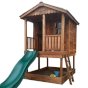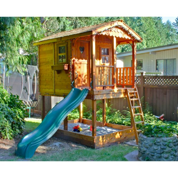 Your child will climb up the ladder, step onto the porch and enjoy the adventures playing in this Sunflower Playhouse with sandbox manufactured from western red cedar. Its ample 6 ft. x 9 ft. size and 3 ft. cedar porch deck provide plenty of space for your child to enjoy his or her own simulated living space. The sandbox includes a ladder, 3.5 in. x 3.5 in. post with 1.5 in. x 5.5 in. girders for the sandbox. The playhouse cabin features 3 aluminum windows and a functional Dutch door. The roof comes with cedar shingles already attached. The slide is not included.