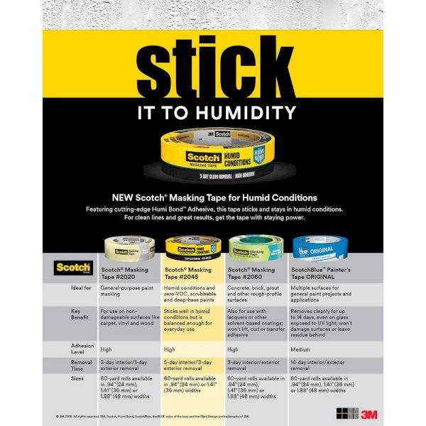 Good masking is the key to sharp, professional-looking paint lines and is the best defense against drips, spatters and accidental brush strokes. Start your painting project right by selecting the right Scotch Masking Tape for your project - consider the surface being masked, the paint type and your environment. Featuring cutting-edge Humi Bond Adhesive, this tape sticks and stays in humid conditions.