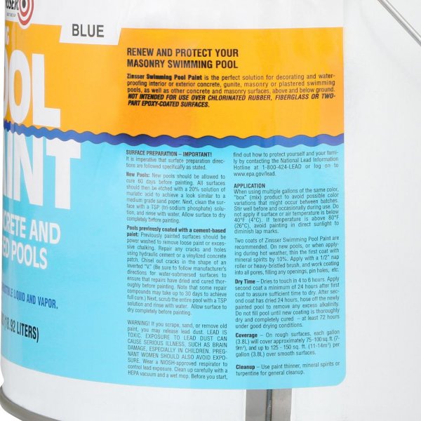 Zinsser 5 gal. Blue Flat Oil-Based Swimming Pool Paint is designed for both interior and exterior application and can look good on almost any pool. This waterproof oil-based formula resists UV damage and features a beautiful matte finish. It can be applied easily with a 1/2 in. nap roller or bristled brush.