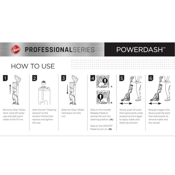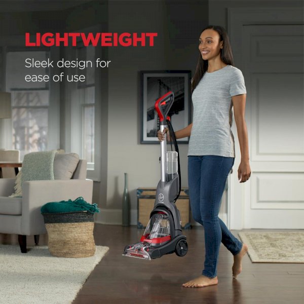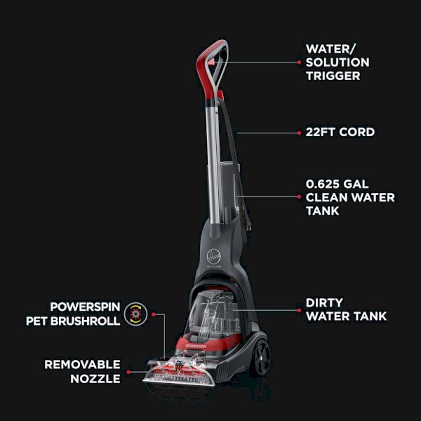 The Hoover PowerDash Complete Carpet Cleaner easily tackles pet messes and everyday stains. It delivers 2X More Cleaning Power than the leading lightweight carpet cleaner. Our new PowerSpin Pet Brush Roll provides a powerful clean for high traffic areas and small spaces and the antimicrobial protection keeps your brush roll safe from odor and bacteria. The lightweight design makes it easy to use anywhere, while the compact design makes storage a breeze. Designed with HeatForce power to deliver faster drying for all your messes. Our Dual Tank System keeps clean and dirty water separate plus its is easy to fill, empty and rinse, while the removable nozzle allows you to easily clean away all that dirt and grime. The Low Profile Foot helps you easily reach and remove stains in tight places and under furniture for a more convenient cleaning experience. Tackle pet messes and everyday stains with the new Hoover PowerDash Complete Carpet Cleaner.