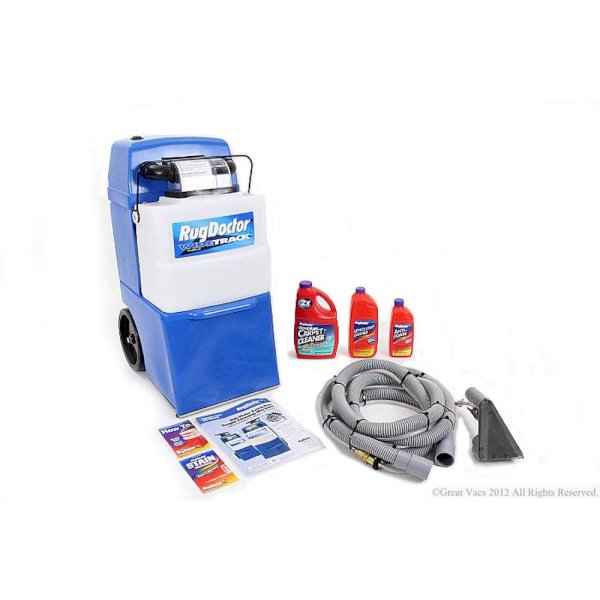 This is the famous Rug Doctor Wide Track Pro. You will pay about double for it than the big box shampooers (that don't work as good) but the warranty says it all. It comes with a 5-year warranty and all the big box shampooers only come with a 1-year warranty. So if you are ready to quit throwing your money away on shampooers that don't work and invest in a quality shampooers that you will have for years and years here is your chance. This is the Wide Track Pro model which is the better model and shampoos much faster. This is a Demo model unit that was only used to show how it works and was only turned on a couple of times, so it looks and runs like new. The handle Adjusts for different heights so if you are tall or short this will be perfect for you Wide 12 in. cleaning path Powerful 28 lbs./sq. in. pump water pressure. Large 2.6 Gal. solution tank capacity. Compare this to most big box shampooers that only have around 1 Gal. tank. This is nice as you wont be filling it up constantly as you shampoo. The Rug Doctor unique vibrating brush: Different from rotary brushes which can have a matting effect, the back and forth motion of the vibrating brush allows thorough cleaning of each fiber and helps the vacuum action in lifting the fibers with each pass. Carpets dry fluffy and soft.