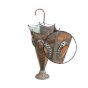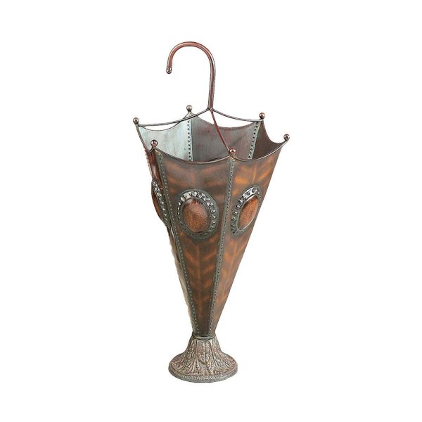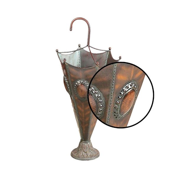 This iron metal umbrella stand is designed with an umbrella-shaped body with ball tips, iron rod braces, a curved umbrella-inspired handle and a round tapered base for stability. This umbrella stand is decorated with raised medallions with stud outline details and carved flourish designs on its base, creating a classic style appeal and elegance. The distressed bronze finish of this umbrella stand provides a charming rustic look that helps bring an Old World charm to homes and spaces.
